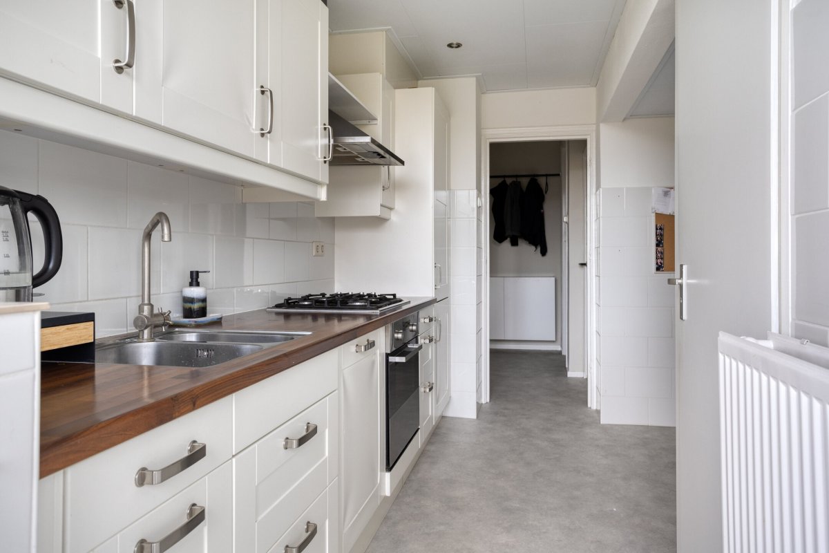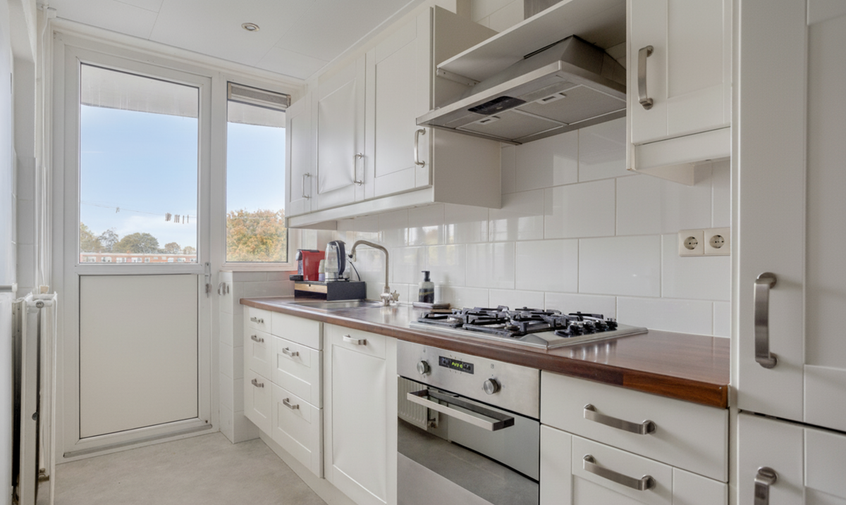 - De keuken is voorzien van de volgende inbouwapparatuur: oven, gaskookplaat, afzuigkap, koelkast en vriezer.