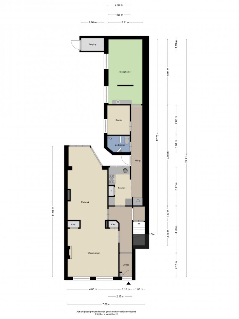 Begane grond: entree, hal, meterkast, trap naar de kelder, woonkamer en eetkamer van ca. 44m², keuken van ca 8m² en voorzien van een wasmachineaansluiting, gang, badkamer voorzien van een douche, toilet en een vaste wastafel, kamer van ca. 6m² en een slaapkamer van ca. 18m².
