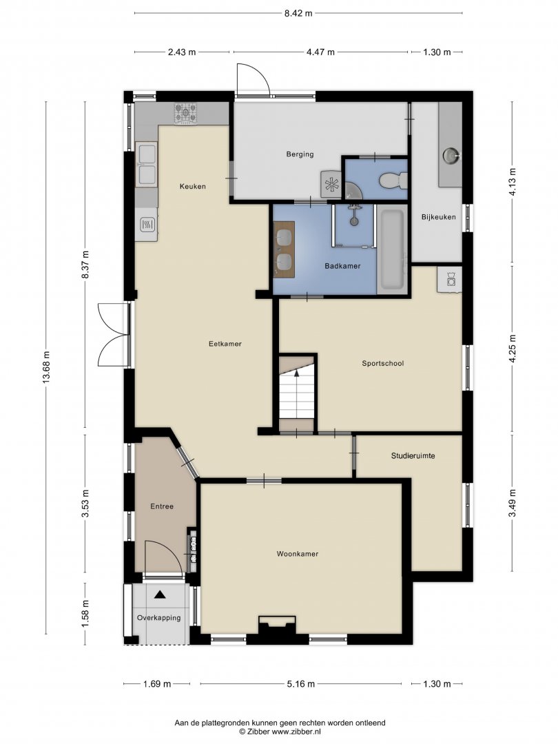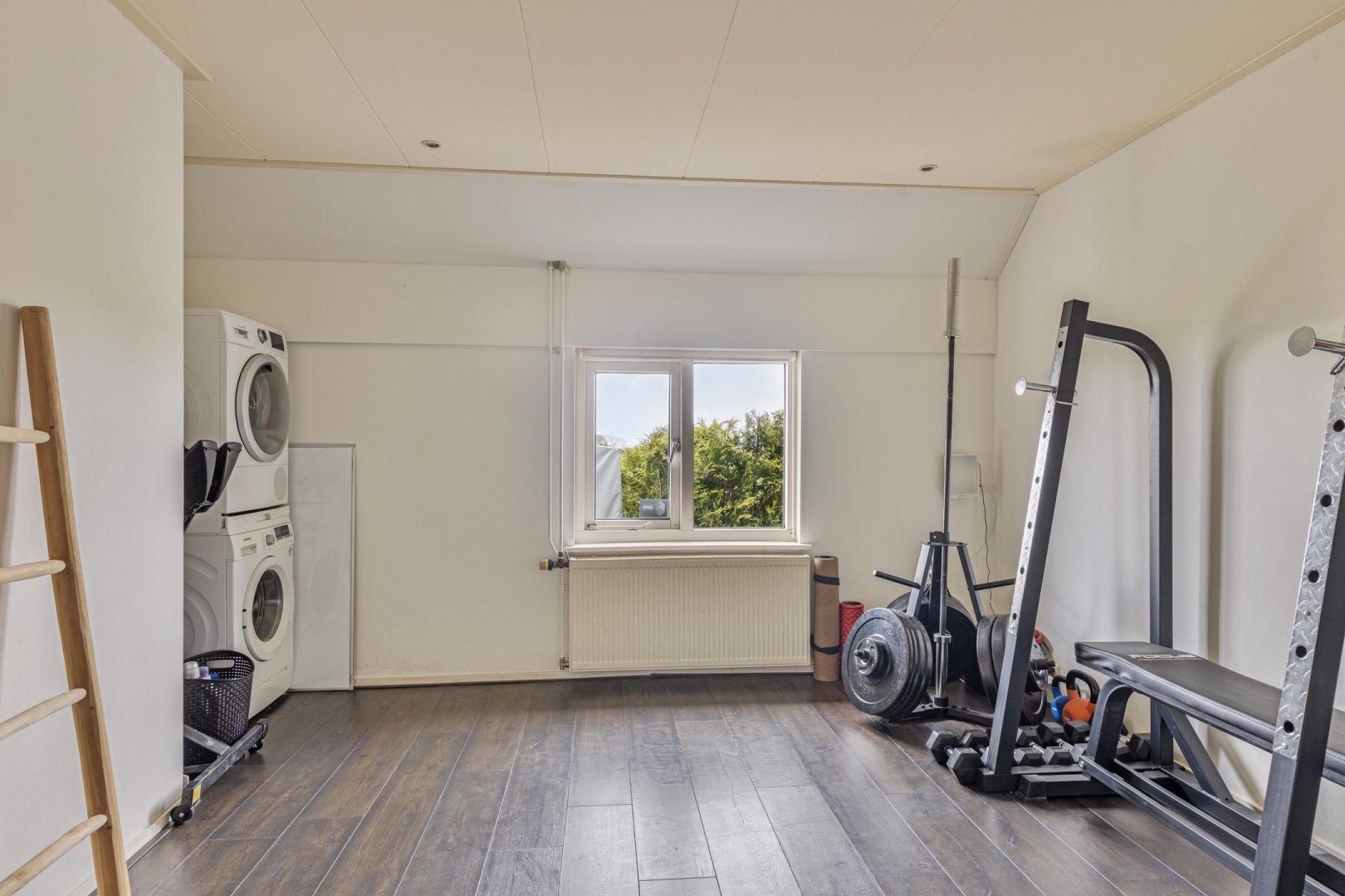 Begane grond: entree, hal, woonkamer van 20m² met vloerverwarming en houtkachel, leefkeuken van 27m², studieruimte/werkkamer, slaapkamer (waar nu de sportschool is) van ruim 15m², badkamer voorzien van ligbad, douche en dubbele wastafel, achterhal, toilet voorzien van fonteintje, bijkeuken.