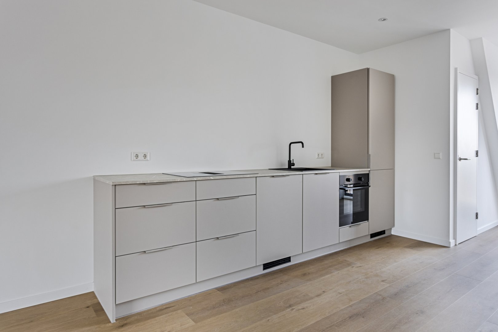 - De keuken is voorzien van een inductiekookplaat met geïntegreerde afzuiging, oven en koel-vriescombinatie.
