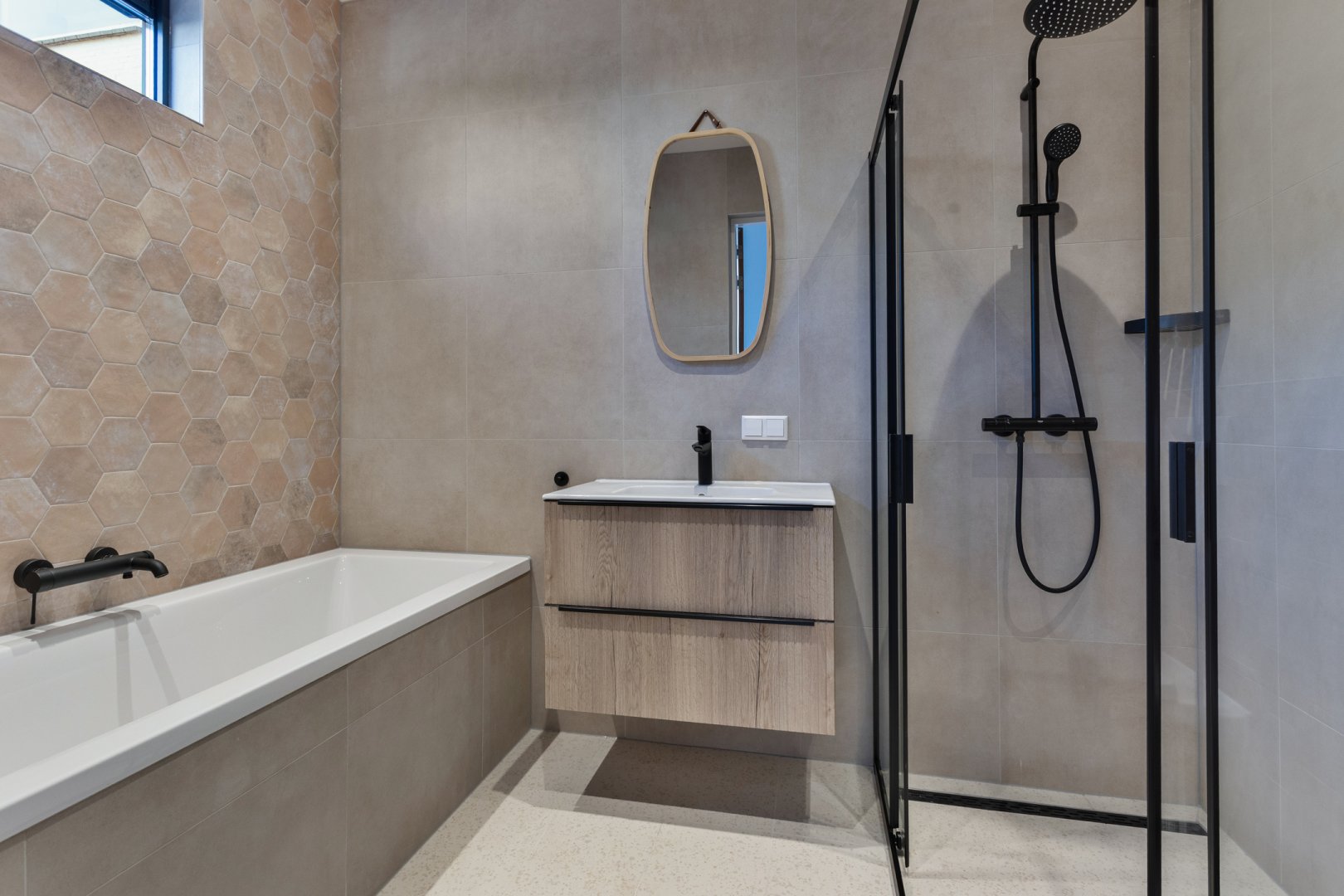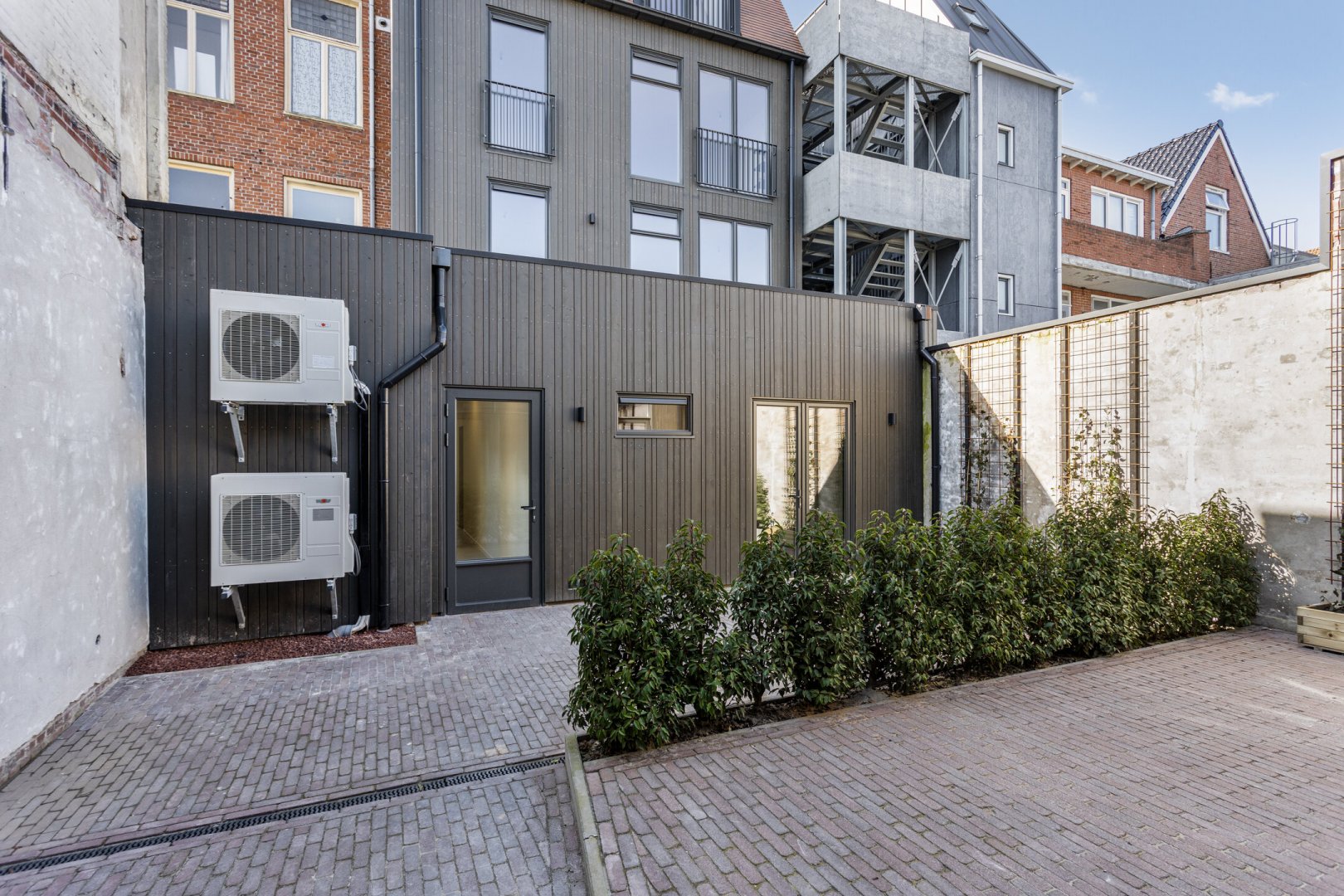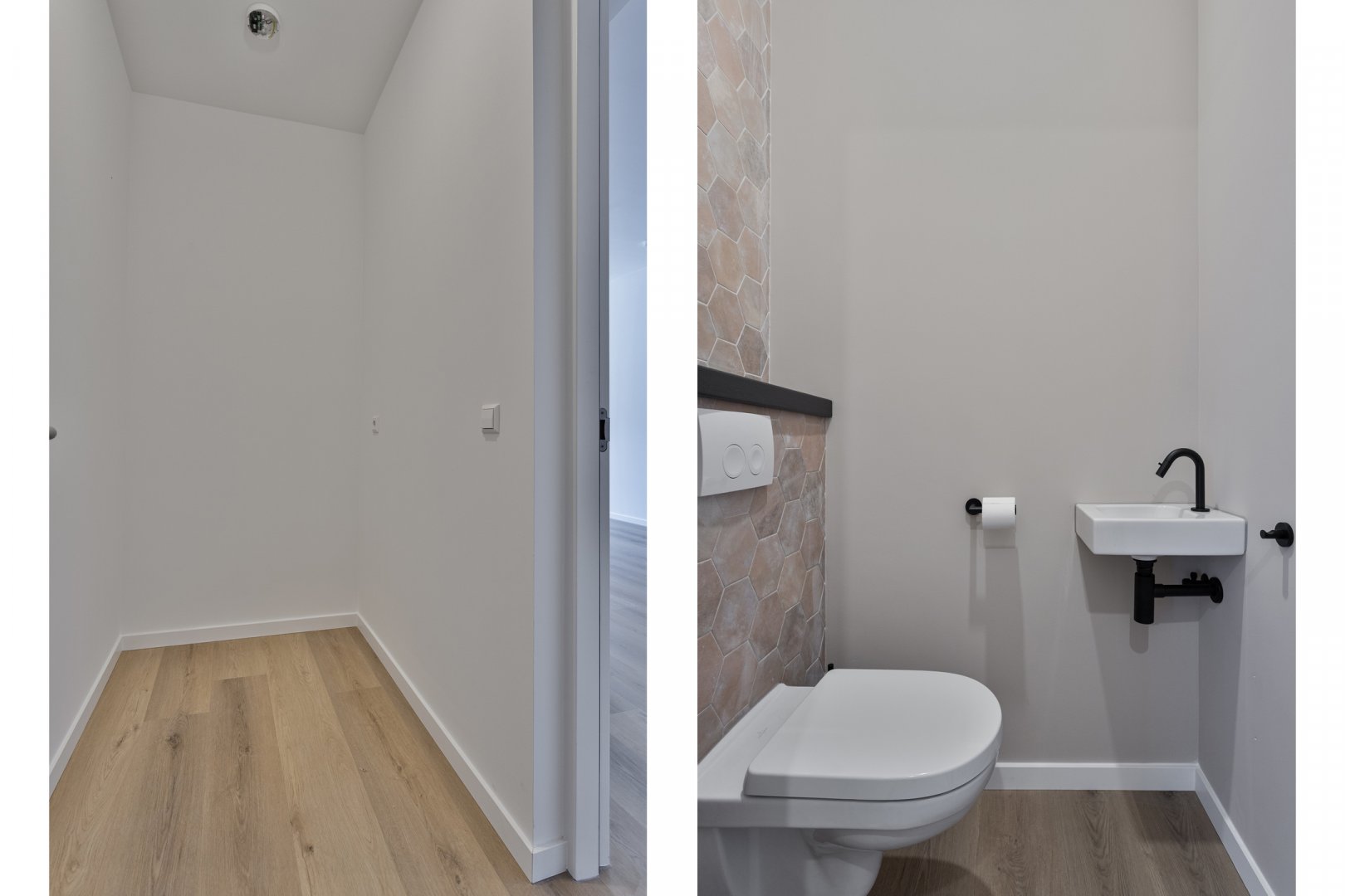 De benedenwoning is toegankelijk vanuit de centrale hal. Bij binnenkomst is er een ruime hal met toilet voorzien van fonteintje. De woonkamer met moderne open keuken is zeer ruim en licht. Samen betreft het een ruimte van 40m².