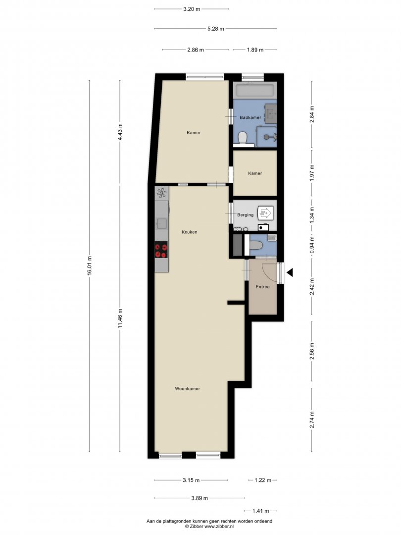 Bij binnenkomst van het complex is er een centrale hal. Vanuit de hal is er een trap naar het souterrain, waar de berging zich bevindt. Het appartement heeft een eigen berging van 8m².