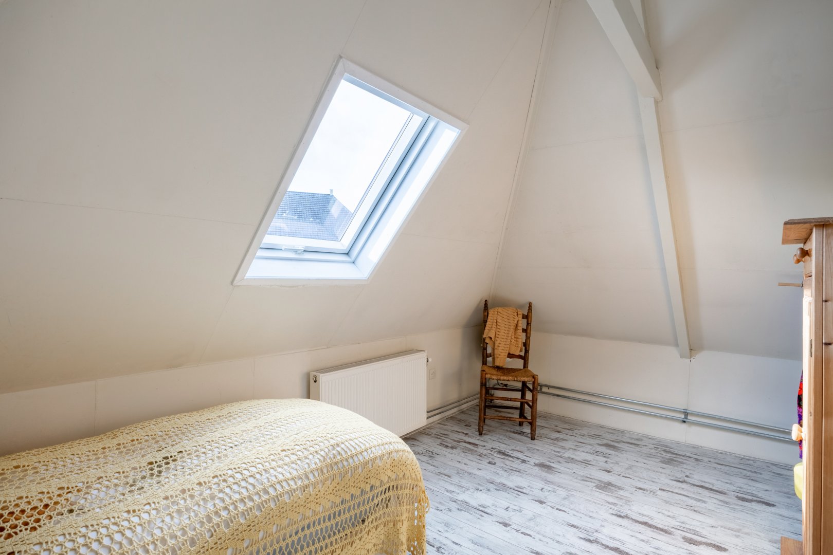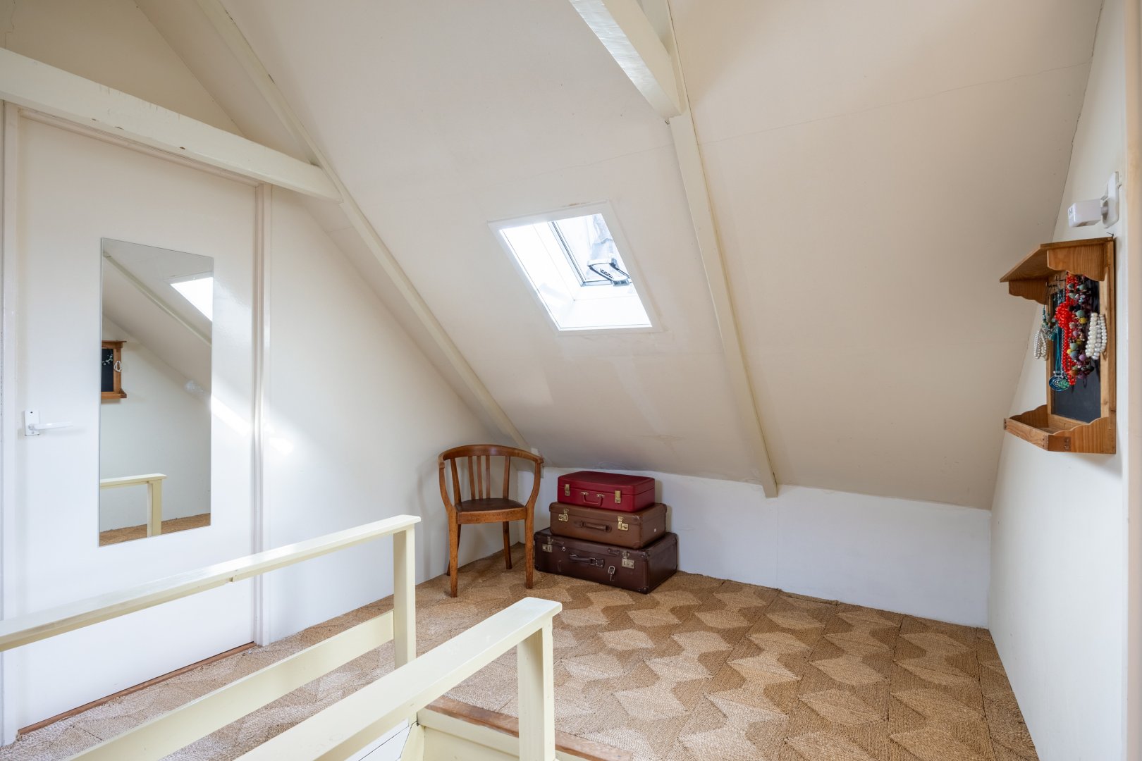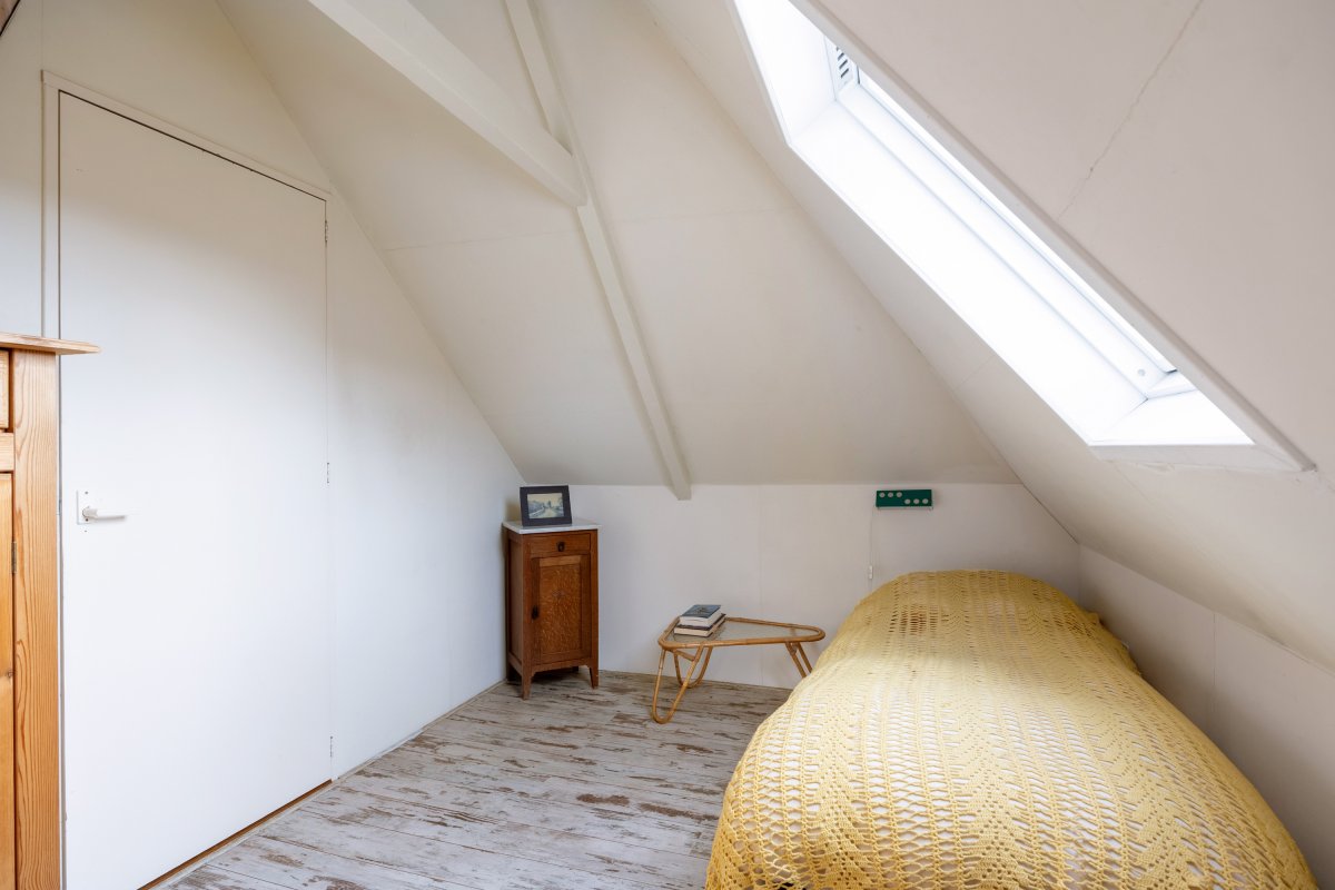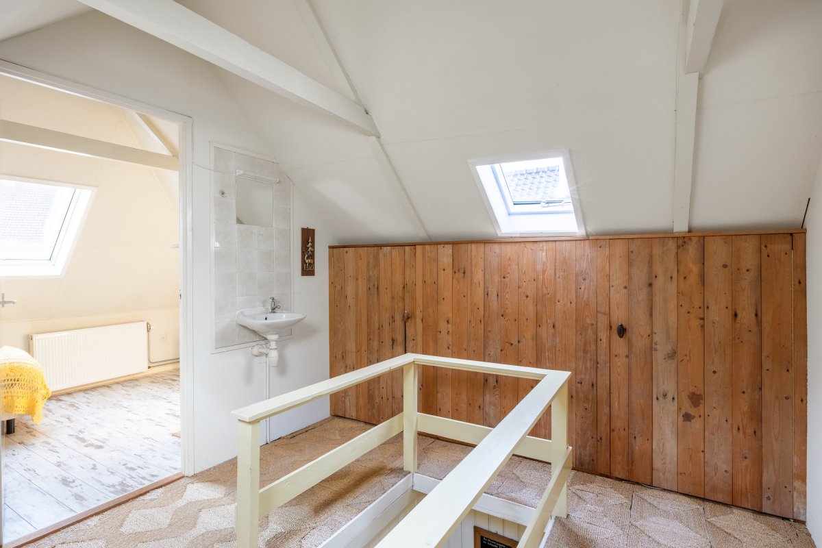Eerste verdieping: overloop met bergruimte, 2 slaapkamers met de kapconstructie mooi in het zicht.