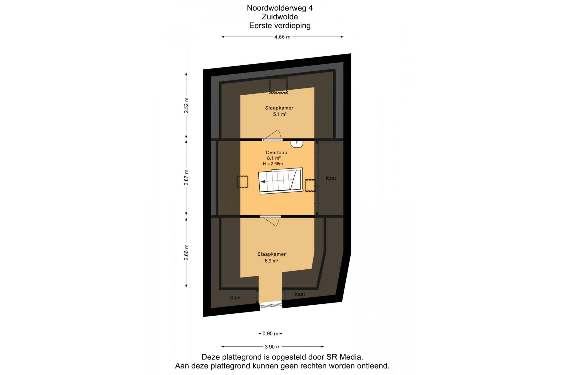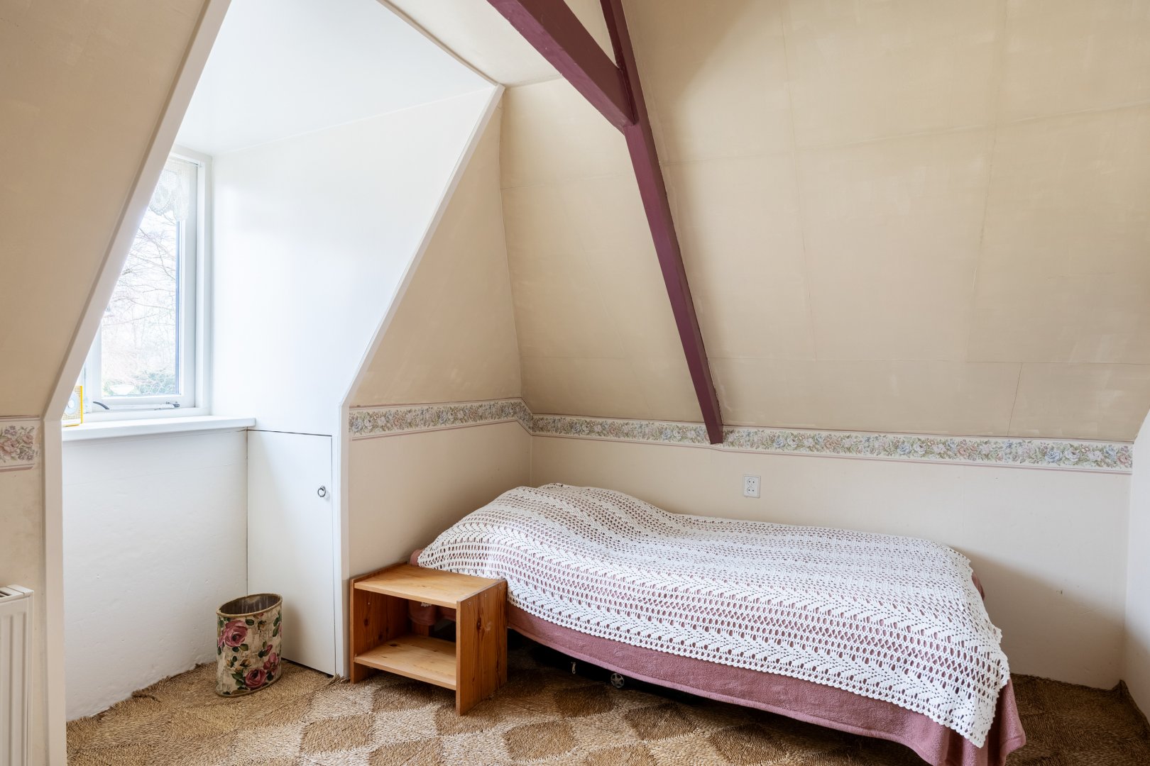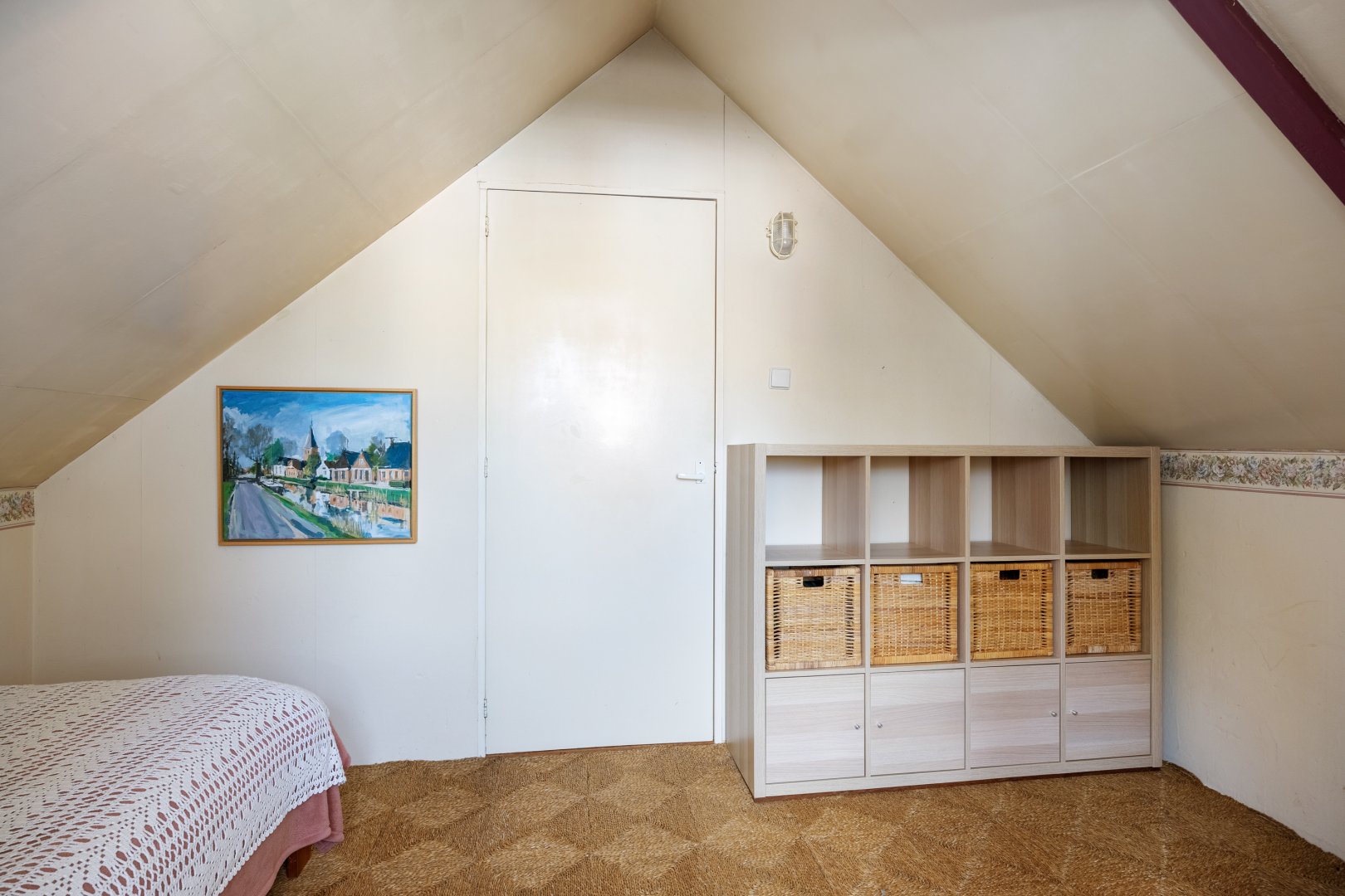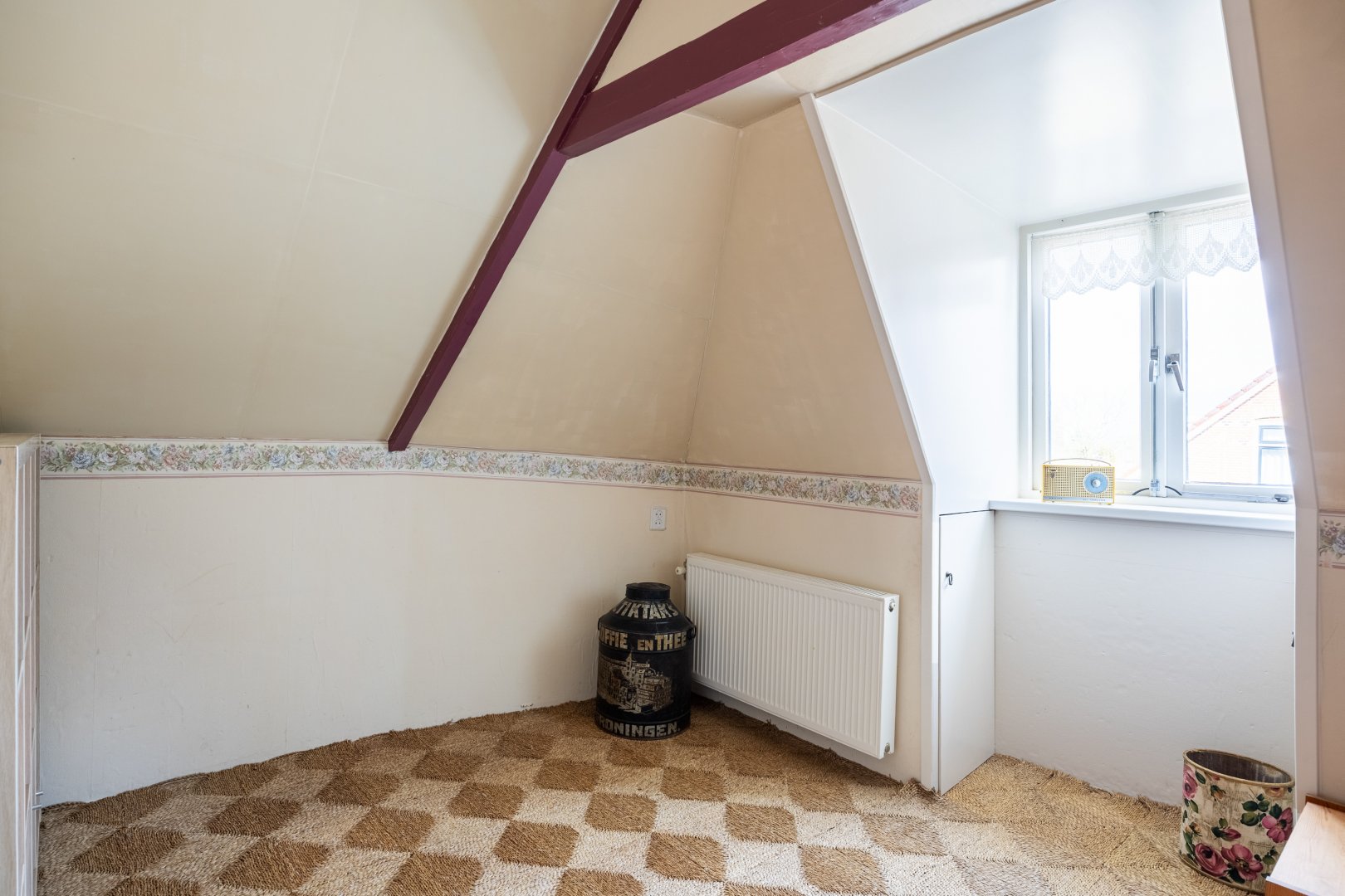 Eerste verdieping: overloop met bergruimte, 2 slaapkamers met de kapconstructie mooi in het zicht.