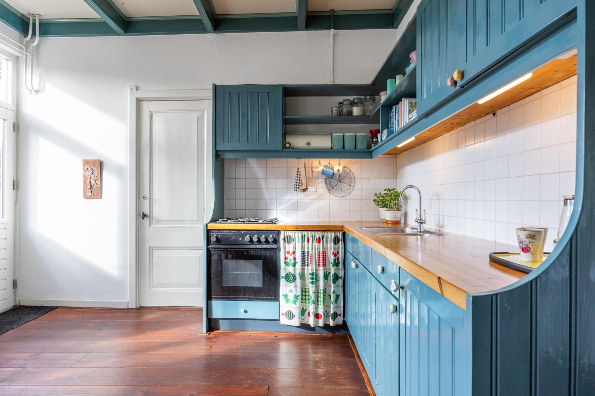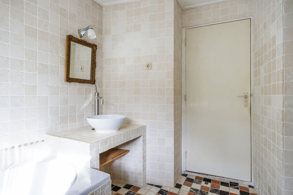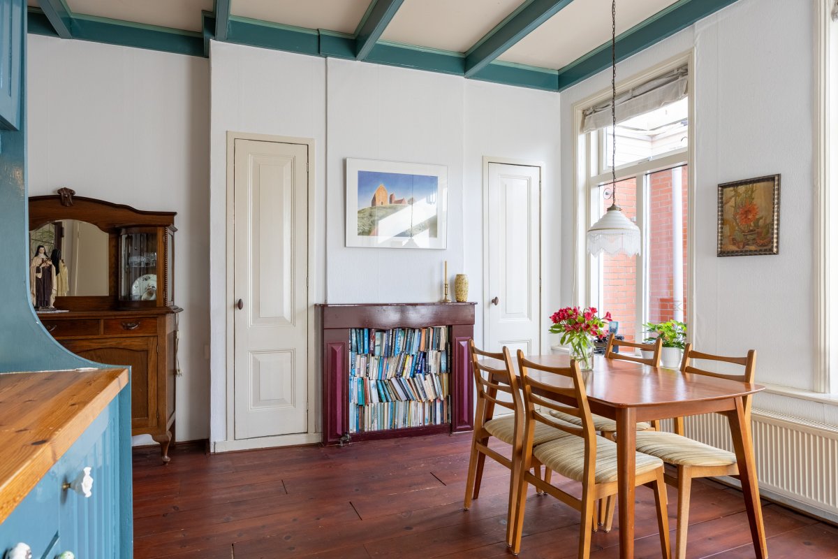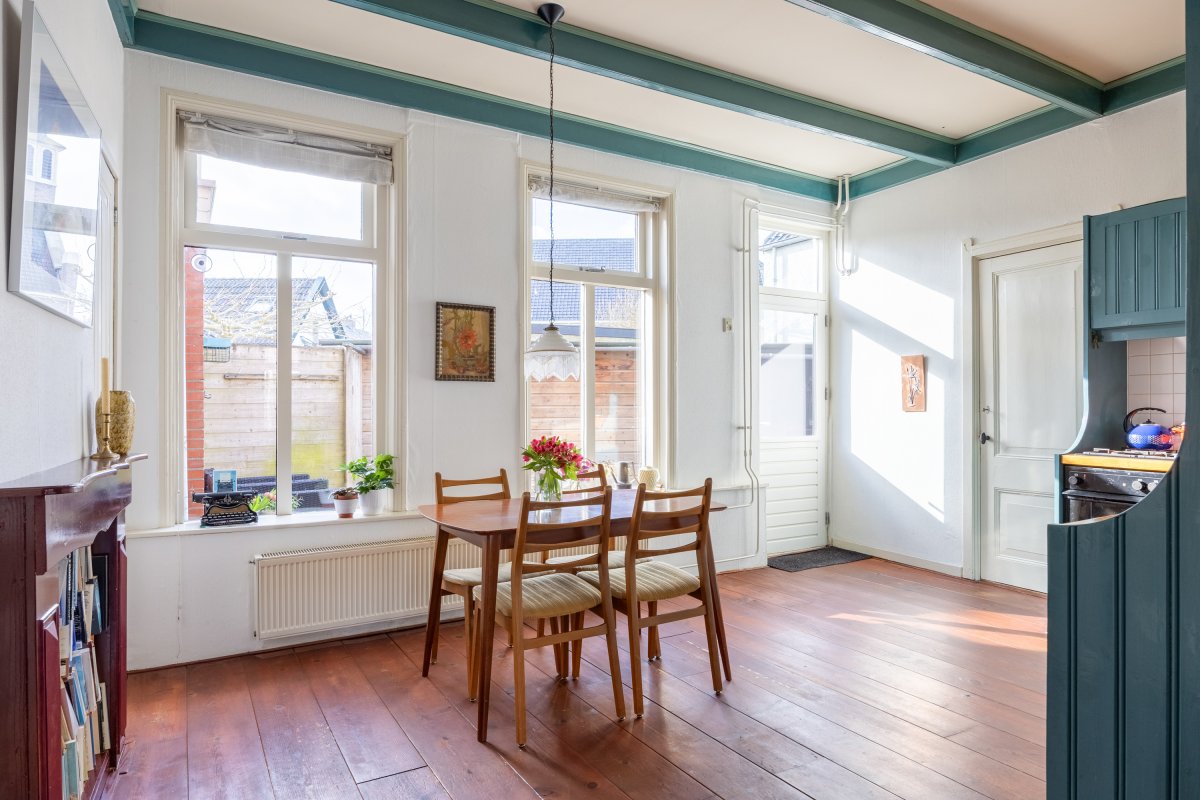 Begane grond: woningentree, gang, woonkamer van 15m² met openslaande deuren met glas-in-lood naar de leefkeuken van 19m² met fijne hoge plafonds. In de keuken zijn diverse inbouwkasten en is er een ruime trapkast aanwezig. Vanuit de keuken is de badkamer te bereiken, welke is voorzien van een afgesloten toilet, bad, wastafelmeubel en wasmachineaansluiting.