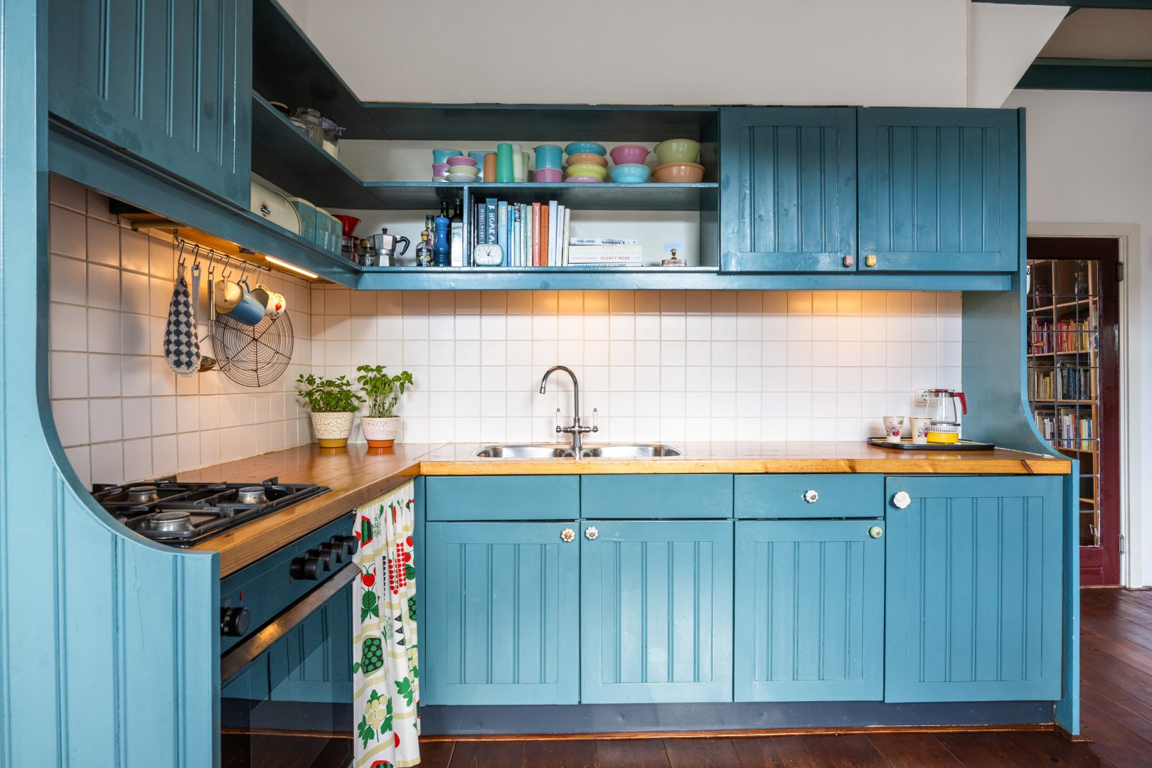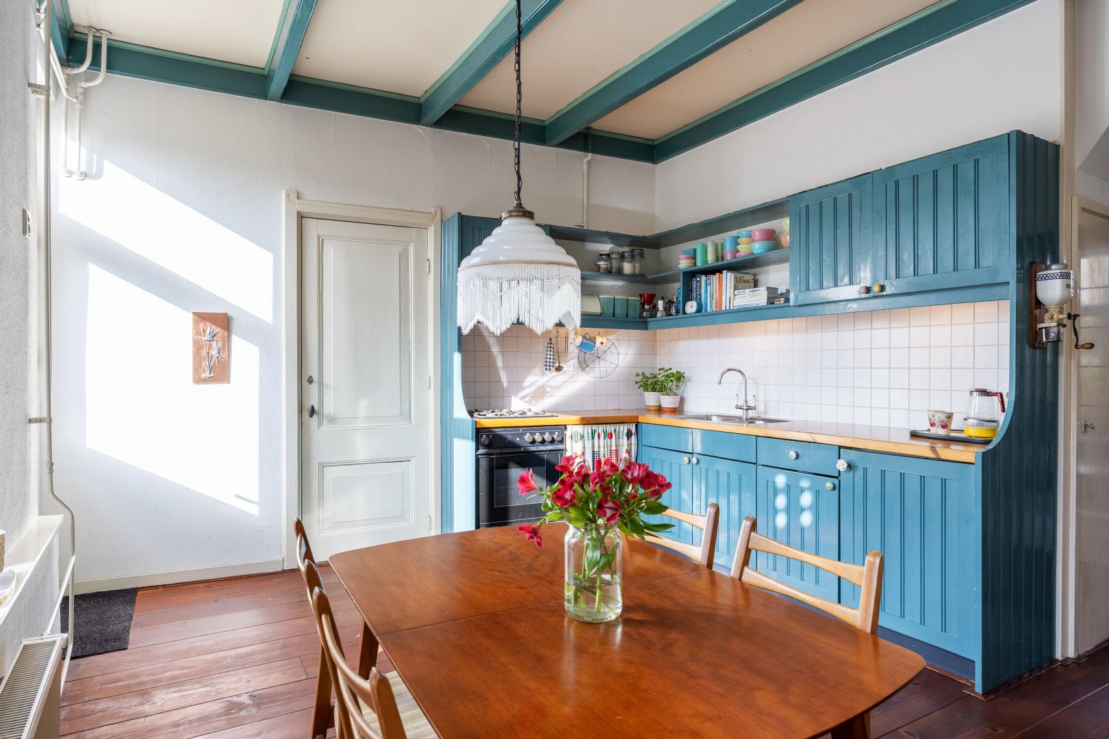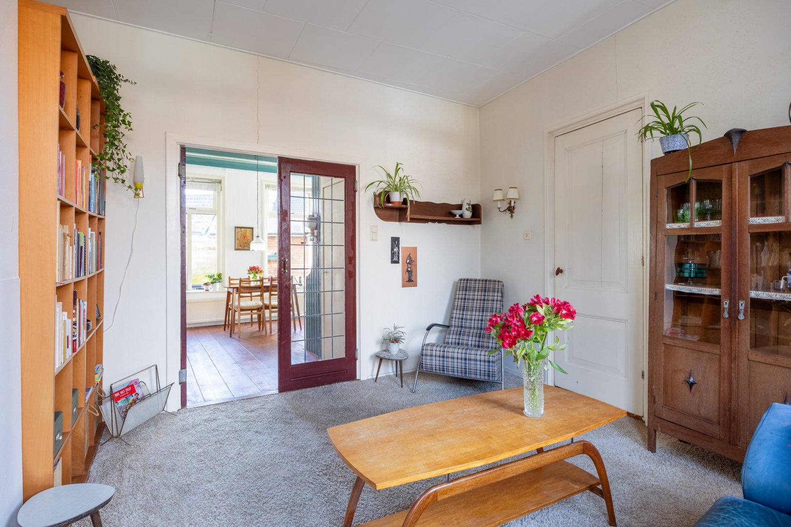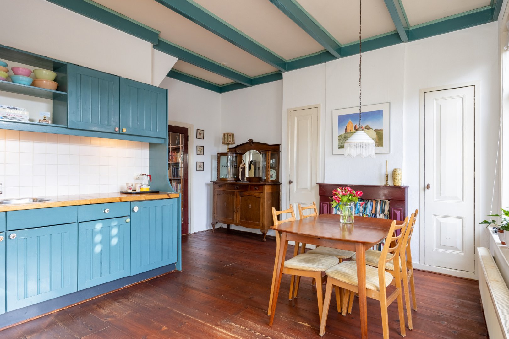 Begane grond: woningentree, gang, woonkamer van 15m² met openslaande deuren met glas-in-lood naar de leefkeuken van 19m² met fijne hoge plafonds. In de keuken zijn diverse inbouwkasten en is er een ruime trapkast aanwezig. Vanuit de keuken is de badkamer te bereiken, welke is voorzien van een afgesloten toilet, bad, wastafelmeubel en wasmachineaansluiting.