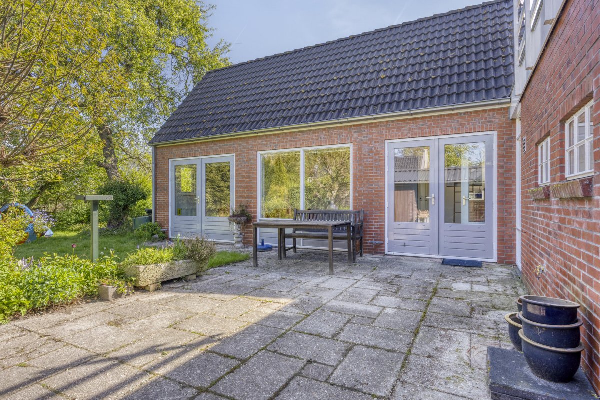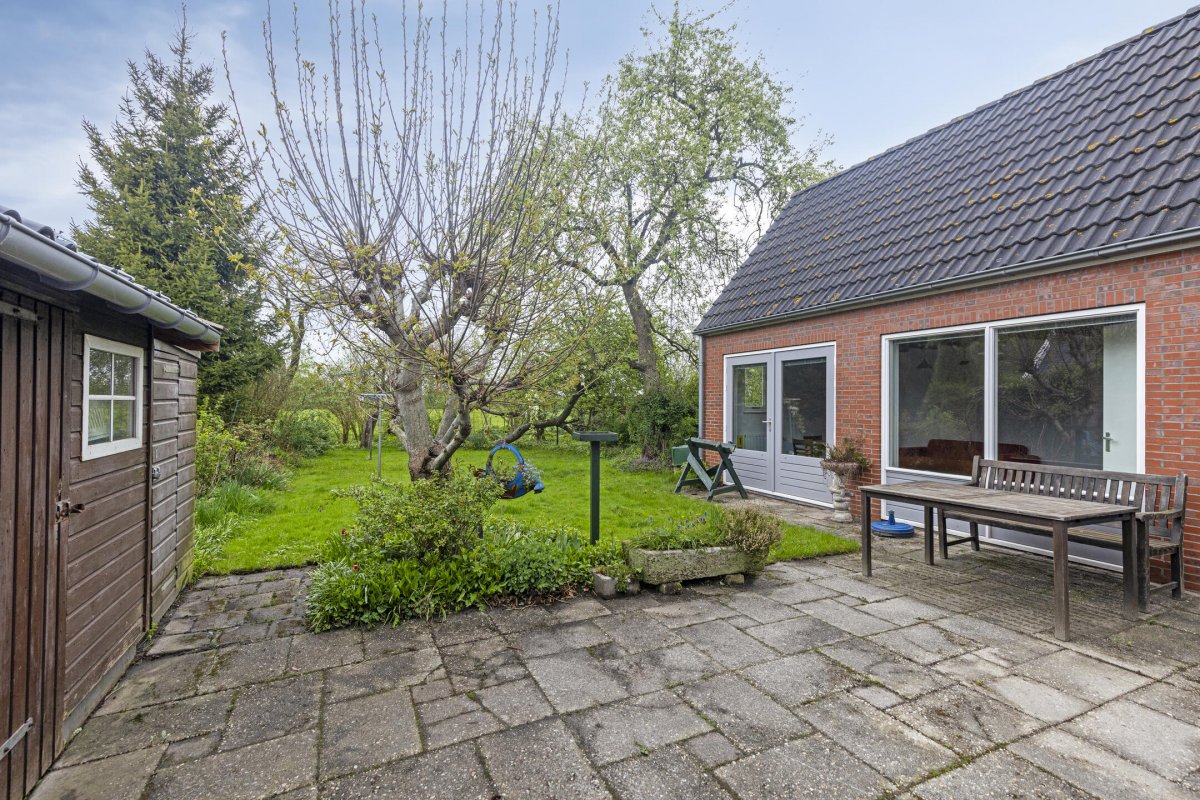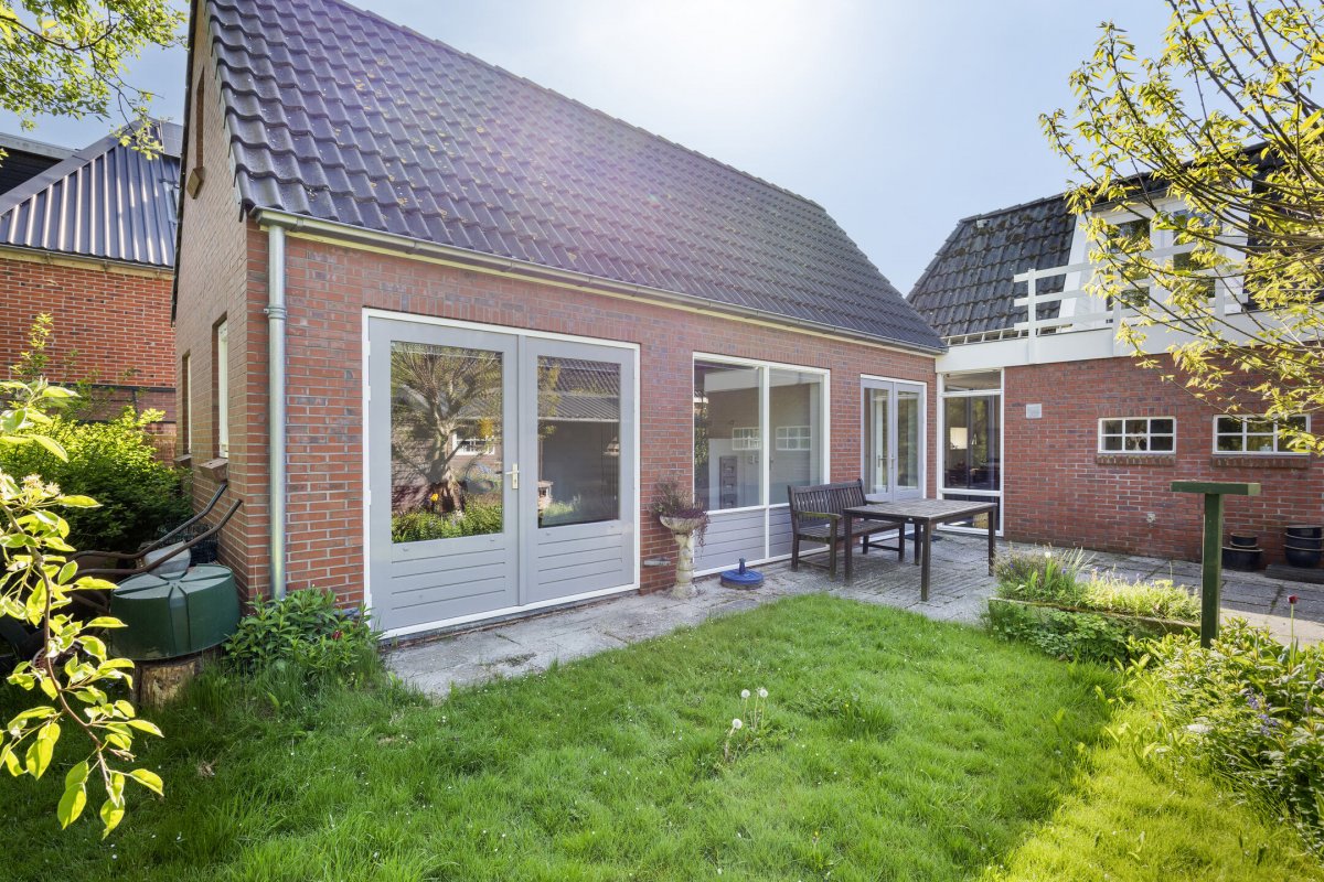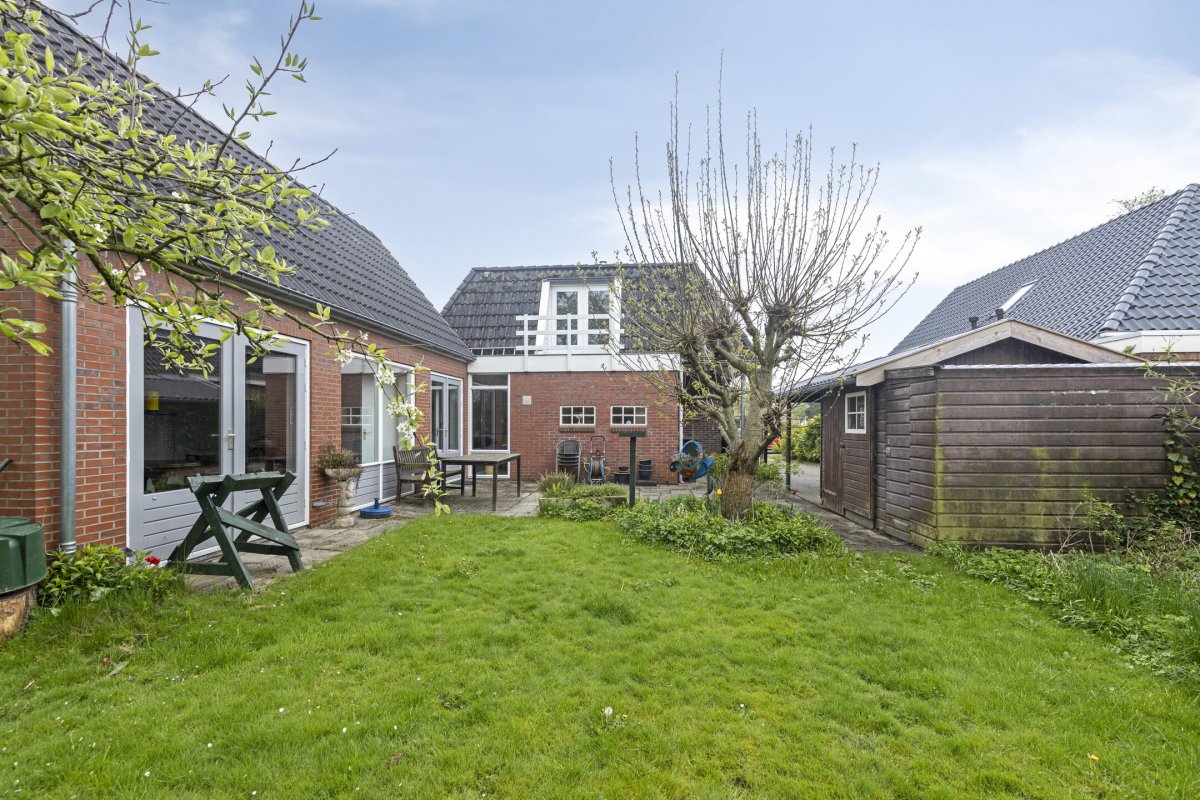 Vanuit de keuken, bijkeuken en multifunctionele kamer is de achtertuin toegankelijk. Het betreft een ruime achtertuin op het noorden met veel privacy door de bomenrij. Door de diepte van de tuin is de tuin zonovergoten. In de achtertuin staat een dubbele houten schuur met veel opbergruimte. Aan de berging grenst een carport. Door de ruime oprit is er plek voor meerdere auto's.
