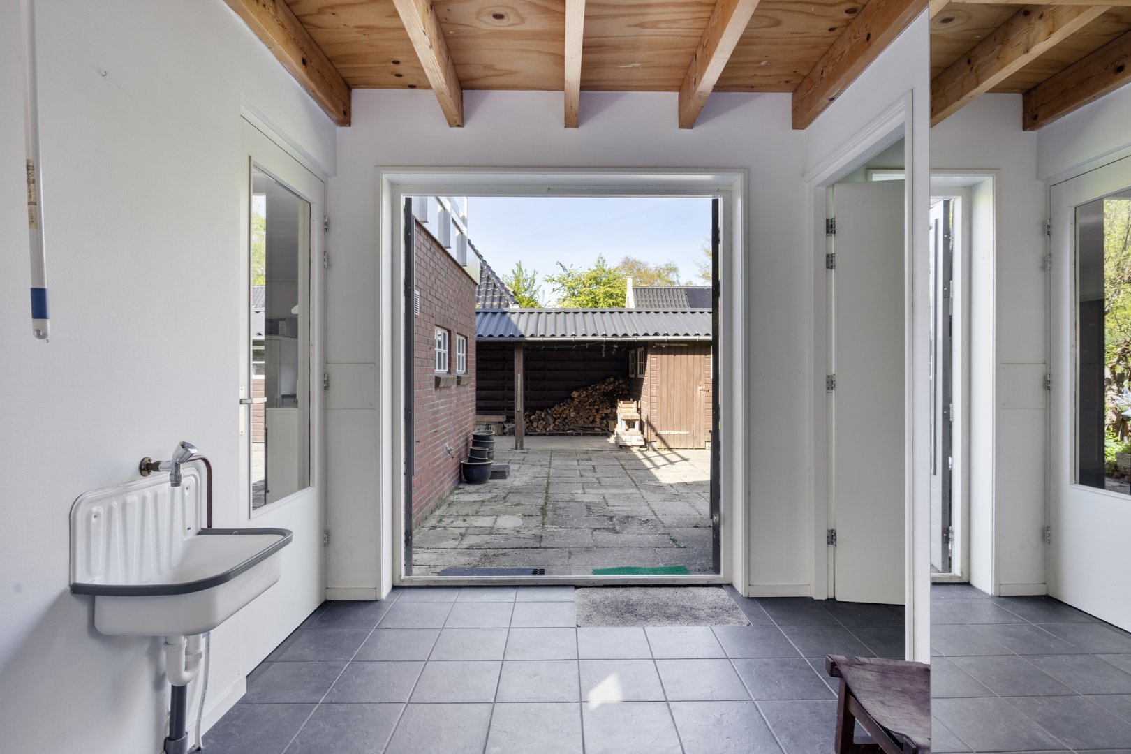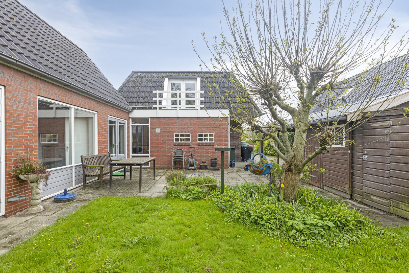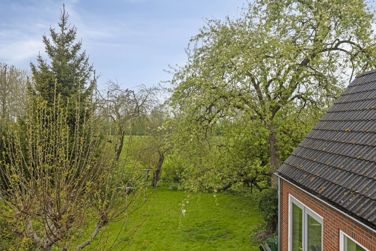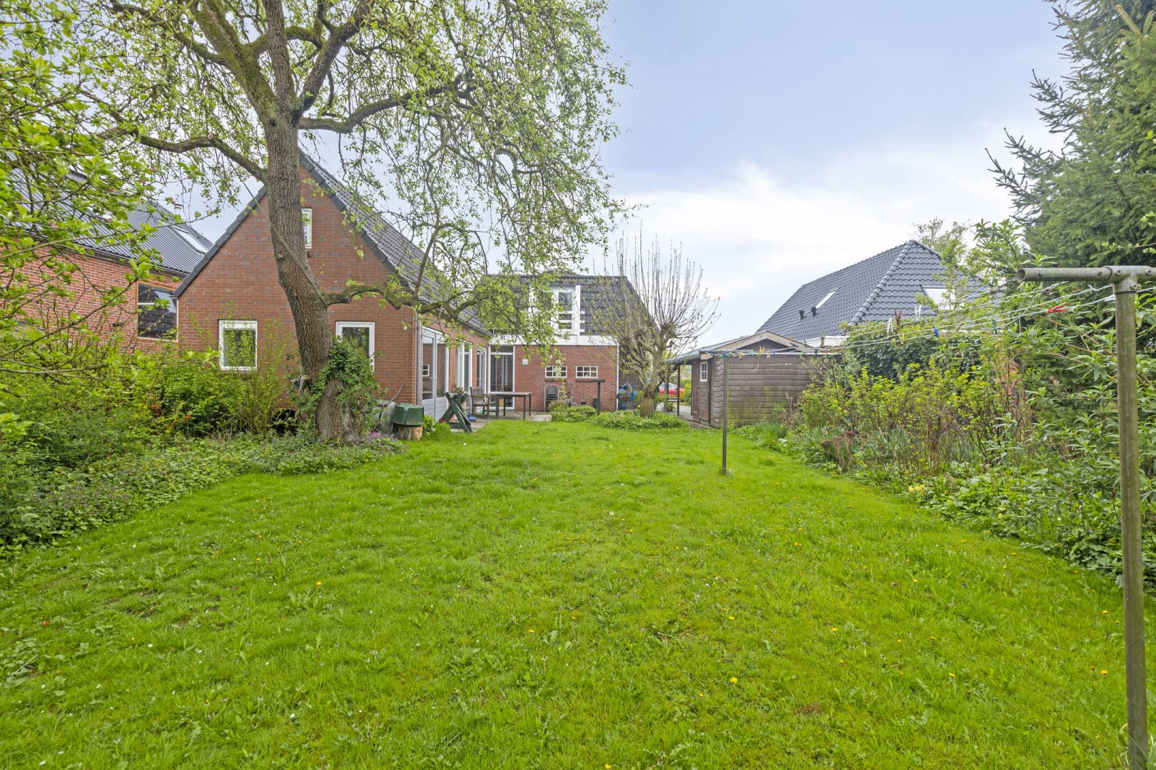 Vanuit de keuken, bijkeuken en multifunctionele kamer is de achtertuin toegankelijk. Het betreft een ruime achtertuin op het noorden met veel privacy door de bomenrij. Door de diepte van de tuin is de tuin zonovergoten. In de achtertuin staat een dubbele houten schuur met veel opbergruimte. Aan de berging grenst een carport. Door de ruime oprit is er plek voor meerdere auto's.