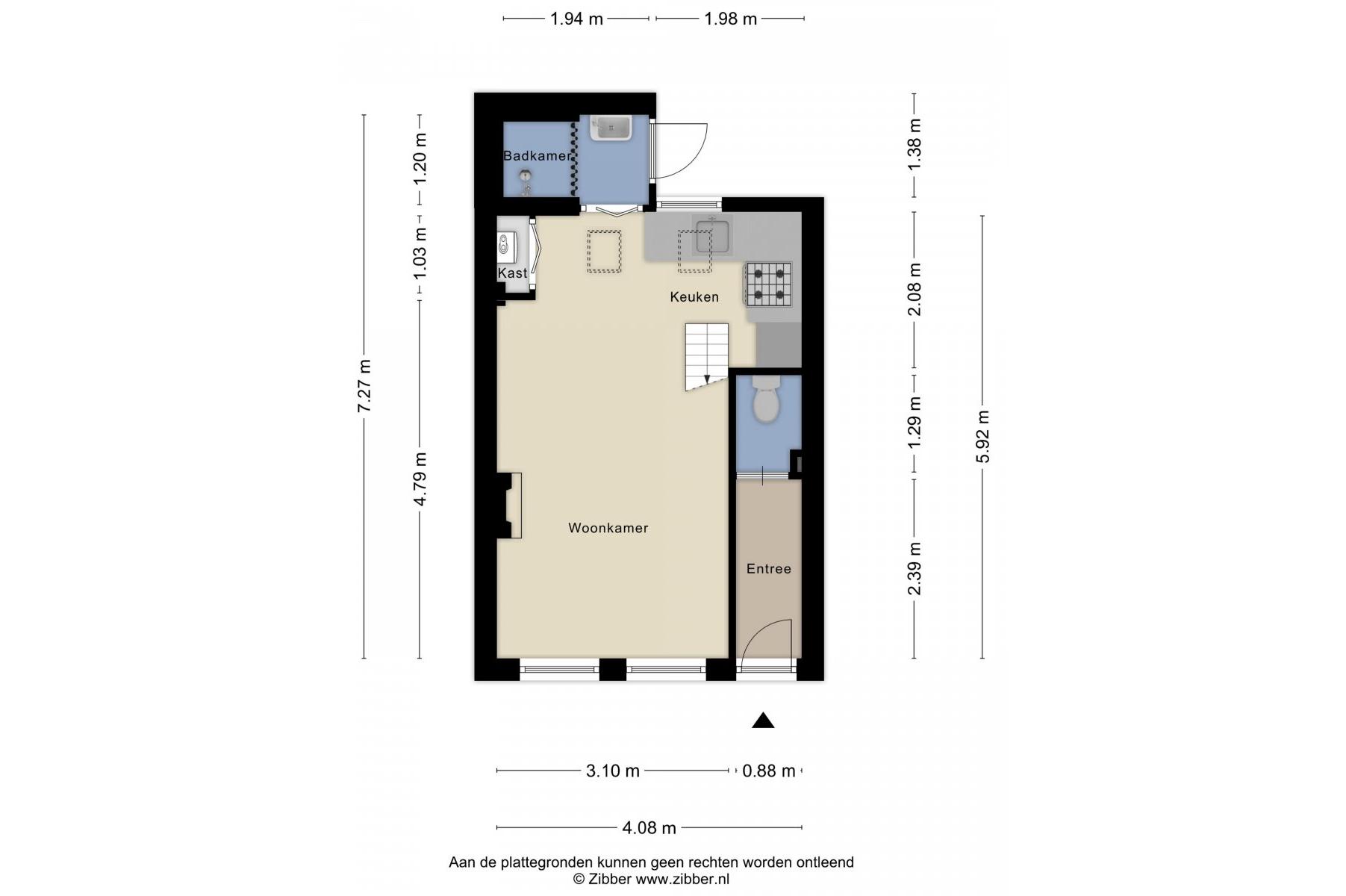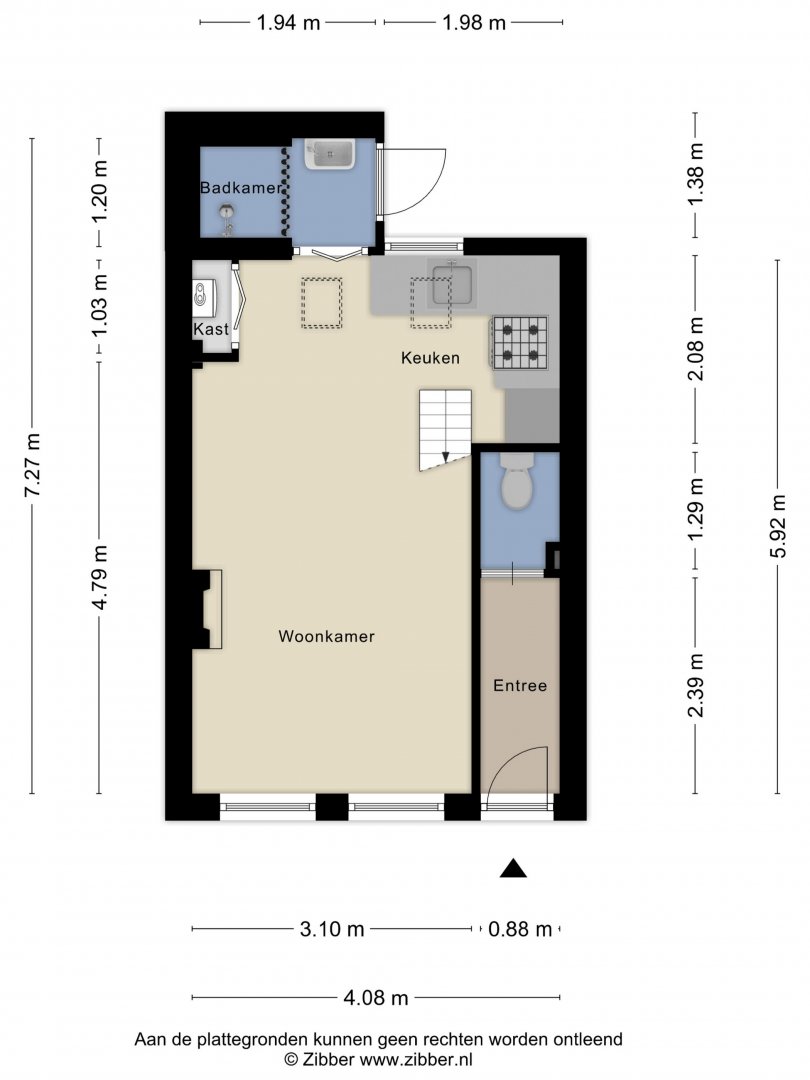 Begane grond: entree, hal, toilet, woonkamer met open keuken van 20m², vaste kast alwaar cv-ketel, badkamer voorzien van douche en vaste wastafel.